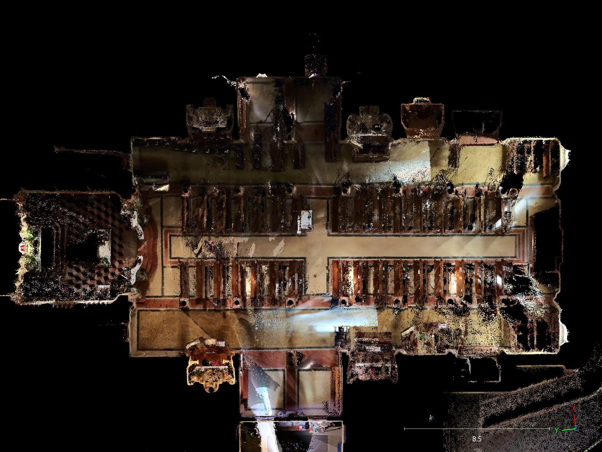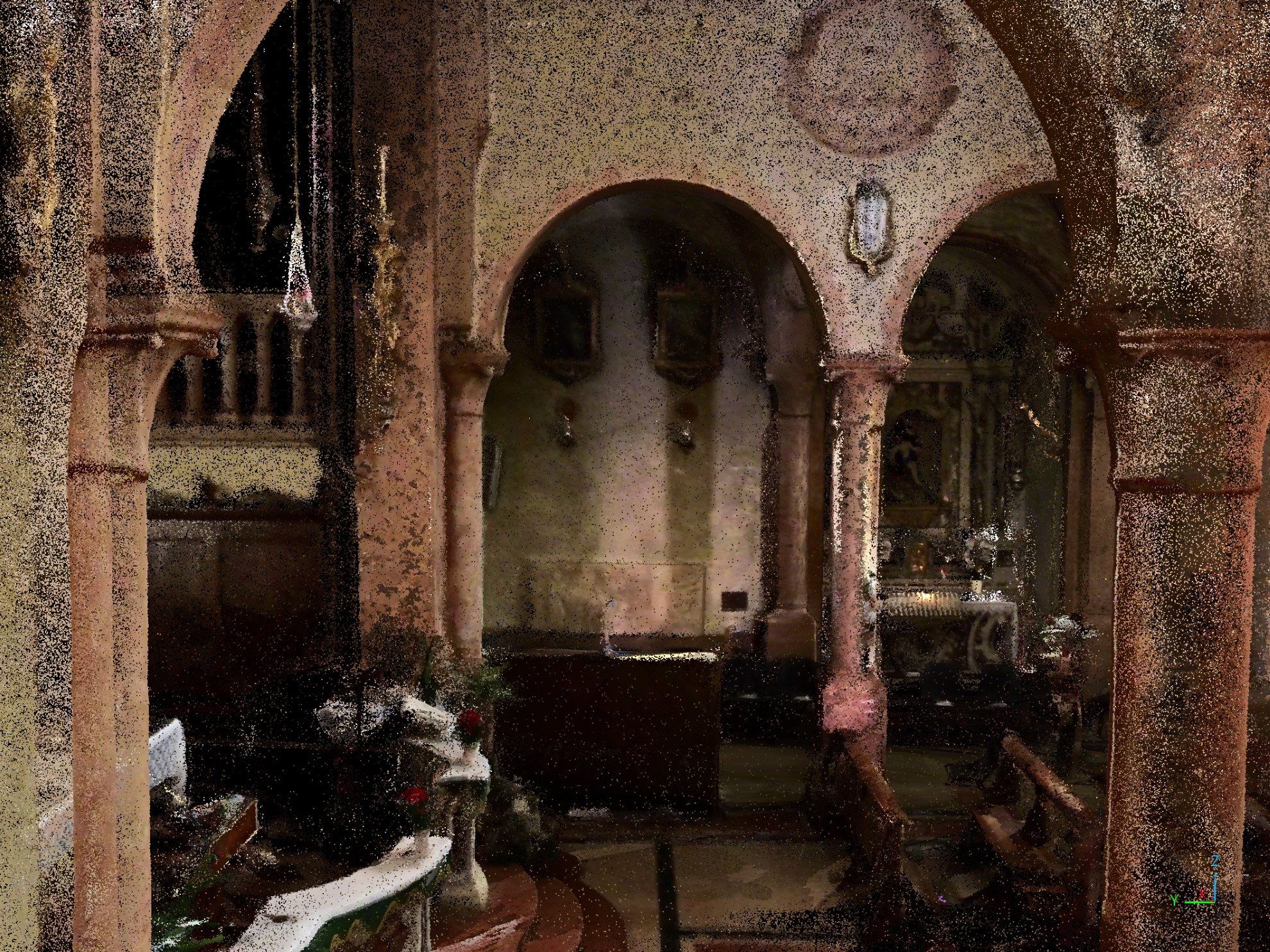 • Qualità del Dato: La nuvola di punti catturata è ideale per l’estrazione metrica di ogni elemento strutturale e decorativo presente.